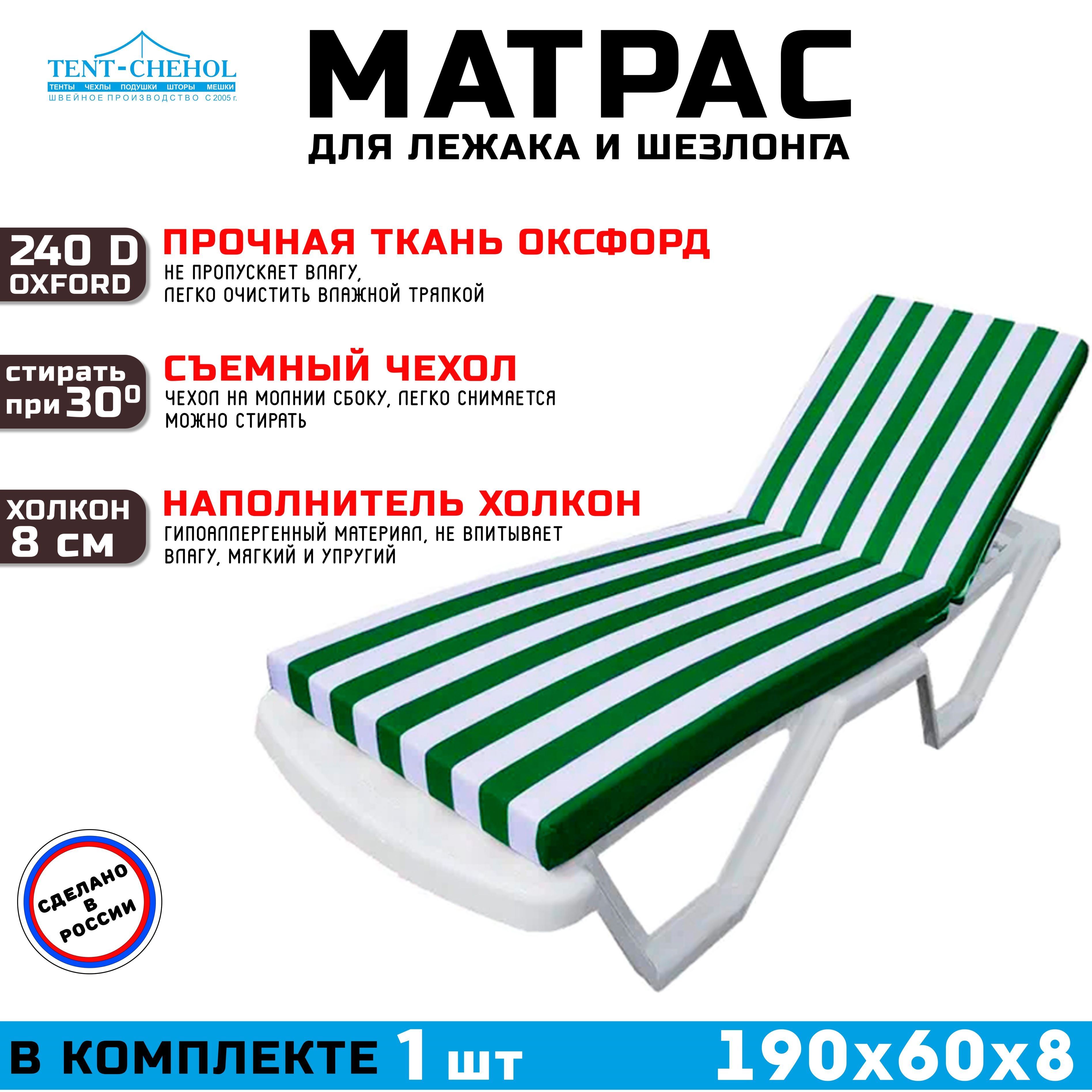 Он имеет длину 190 см, ширину 60 см и высоту 8 см, что идеально подходит для большинства шезлонгов. Наполнитель из холкона обеспечивает мягкую, но поддерживающую поверхность, которая будет поддерживать вашу спину и предотвращать боли в теле.