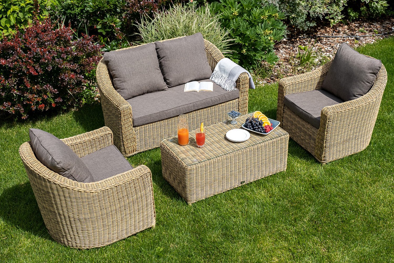 Диван изготовлен из переплетения бежевого искусственного ротанга, что придает ему особый стиль. Для обеспечения комфорта и мягкости во время сидения на диване рекомендуется использовать специальные подушки, которые должны соответствовать его размеру и материалу, способному противодействовать различным погодным условиям.