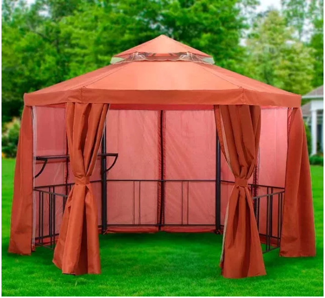 Шторы в комплекте создадут уют и комфорт внутри павильона, обеспечивая приватность и защиту от солнца. Антимоскитная сетка предотвращает проникновение насекомых внутрь павильона, что обеспечивает комфортное времяпрепровождение. Тент, в свою очередь, обеспечивает защиту от непогоды и ультрафиолетовых лучей.